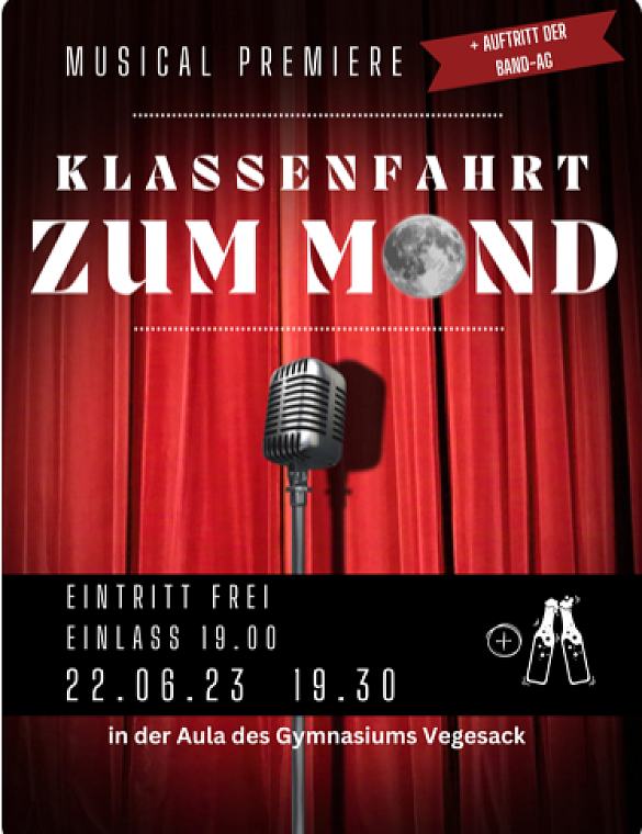 Endlich können wir nach langer Zeit wieder zu einem musikalischen Abend einladen: Am Donnerstag, den 22.06.2023 ab 19 Uhr wird am Gymnasium Vegesack das Musical "Eine Klassenfahrt zum Mond" aufgeführt. Schülerinnen und Schüler von der 5. bis zur 8. Klasse haben in den letzten Wochen fleißig geübt und laden nun zur Aufführung ein. Nach einer Pause, in der es Getränke geben wird, folgt der Auftritt der Band. Schülerinnen und Schüler aus der 7. bis 11. Klasse werden einige Lieder zum Besten geben.