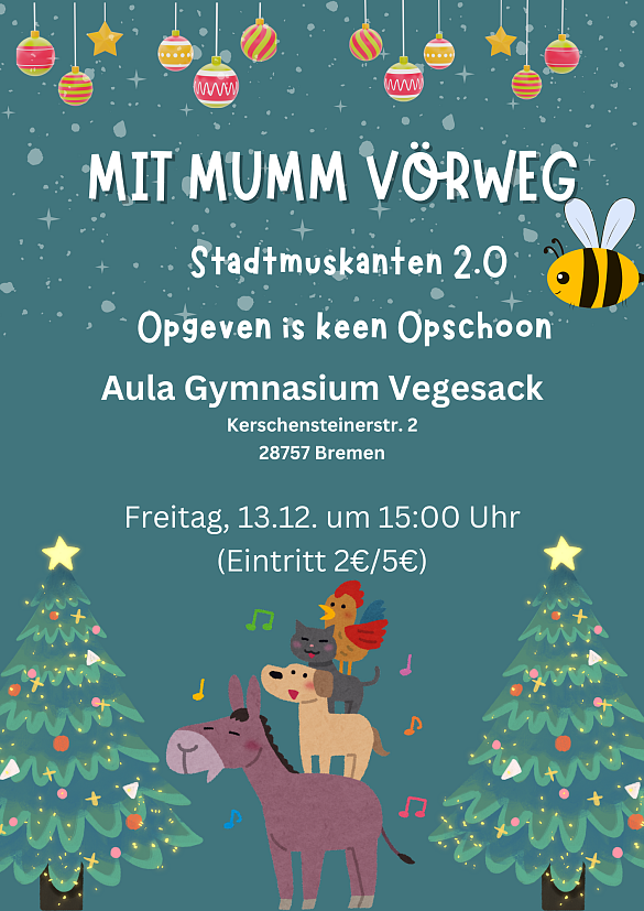 In diesem Jahr präsentieren wir das Weihnachtsstück „Mit Mumm vörweg“, eine moderne Fassung der bekannten Geschichte der Bremer Stadtmusikanten – erzählt auf Plattdeutsch. Doch keine Sorge: Auch ohne Kenntnisse der plattdeutschen Sprache ist das Stück gut verständlich.