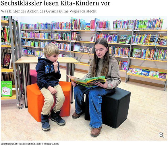 Vegesack. Der elfjährige Malin Pek hatte sich mit der sechsjährigen Ava in eine Ecke der Stadtbibliothek Vegesack zurückgezogen. Er las Ava aus dem Buch „Der kleine Eisbär und der Angsthase“ von Hans de Beer vor. In Bildern und mit Worten erzählt de Beer die Geschichte des Eisbären Lars, der den Schneehasen Hugo aus einem Loch hilft. Malin gehört der Klasse 6b des Gymnasiums Vegesack an. Ava kommt aus dem Kinder- und Familienzentrum (KuFZ) Schönebeck. Beide Einrichtungen hatten sich darauf verständigt, dass am Freitagvormittag die 27 Schülerinnen und Schüler der 6b den fünf- und sechsjährigen Kindern des KuFZ etwas vorlesen.