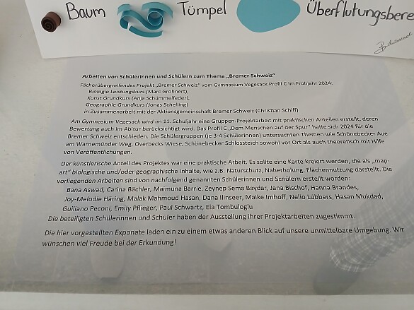 Das Ergebnis dieser intensiven Arbeit ist nun in der Ausstellung „AG BREMER SCHWEIZ – EIN STREIFZUG DURCH DIE BREMER SCHWEIZ“ im Schloss Schönebeck zu sehen. Besonders stolz sind wir darauf, dass auch die künstlerischen Werke unserer Schülerinnen und Schüler Teil der Ausstellung sind und somit einem breiten Publikum präsentiert werden.