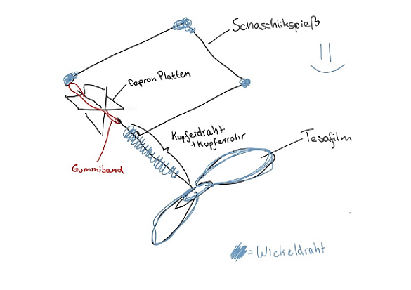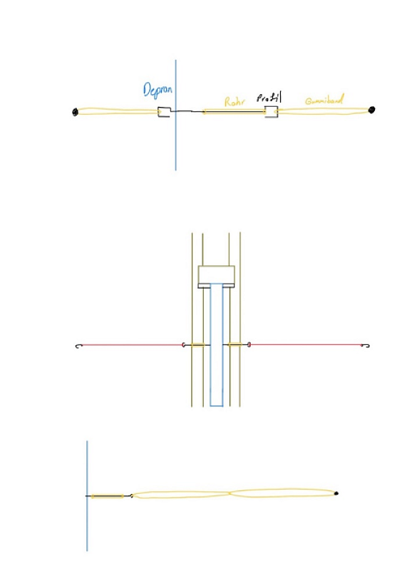 Der Motor war dabei das wohl am schwierigsten umzusetzenden Teil. Wir haben uns letzten Endes alle für einen Gummibandantrieb entschieden, da man mit diesem genug Vorschub erzeugen kann, um das Luftschiff nach vorne zu bewegen.
